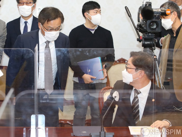 [서울=뉴스핌] 김학선 기자 = 박범계 법무부 장관과 조남관 검찰총장 직무대행이 10일 서울 종로구 정부서울청사에서 열린 'LH 직원들의 신도시 투기의혹 수사협력 관련 회의'에서 인사를 나누고 있다. 2021.03.10 yooksa@newspim.com