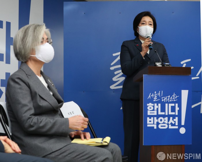 [서울=뉴스핌] 국회사진취재단 = 4·7 서울시장 보궐선거 더불어민주당 박영선 후보가 11일 오후 서울 종로구 율곡로 선거운동사무실에서 열린 국제협력위원회 출범식 행사에서 인사말을 하고 있다. 왼쪽은 선거캠프 국제협력위원장을 맡은 강경화 전 외교부 장관. 2021.03.11 photo@newspim.com