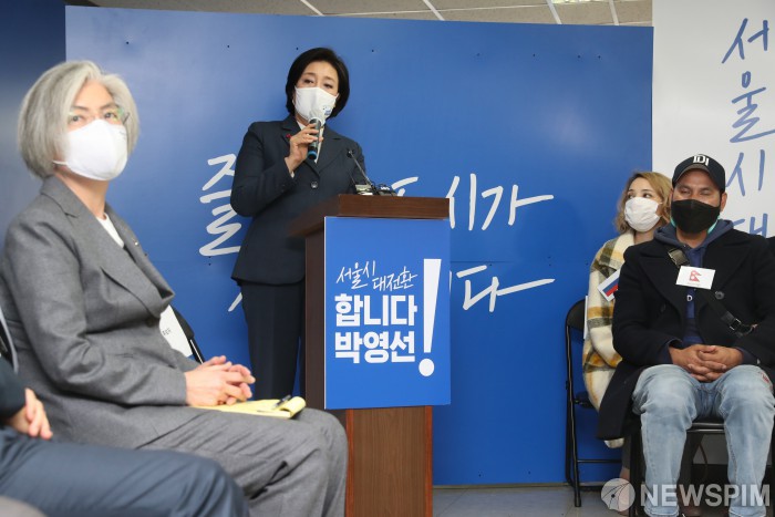 [서울=뉴스핌] 국회사진취재단 = 4·7 서울시장 보궐선거 더불어민주당 박영선 후보가 11일 오후 서울 종로구 율곡로 선거운동사무실에서 열린 국제협력위원회 출범식 행사에서 인사말을 하고 있다. 왼쪽은 선거캠프 국제협력위원장을 맡은 강경화 전 외교부 장관. 2021.03.11 photo@newspim.com