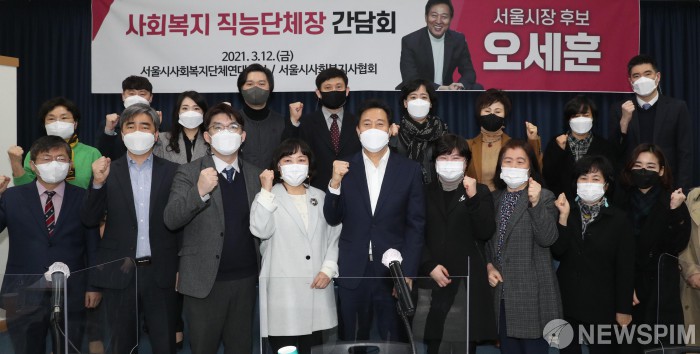 [서울=뉴스핌] 국회사진취재단 = 12일 오세훈 국민의힘 서울시장 후보가 서울 영등포구 서울시사회복지사협회를 찾아 서울시 소재 사회복지시설단체 대표자들과 간담회에 앞서 기념촬영을 하고 있다. 2021.03.12 photo@newspim.com