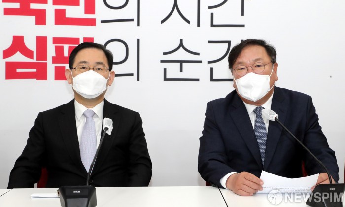 [서울=뉴스핌] 최상수 기자 = 12일 오전 서울 국회 국민의힘 원내대표실에서 김태년 더불어민주당 대표 직무대행(오른쪽)과 주호영 국민의힘 원내대표(왼쪽)가 만나 현안에 대해 이야기를 하고 있다. 2021.03.12 kilroy023@newspim.com