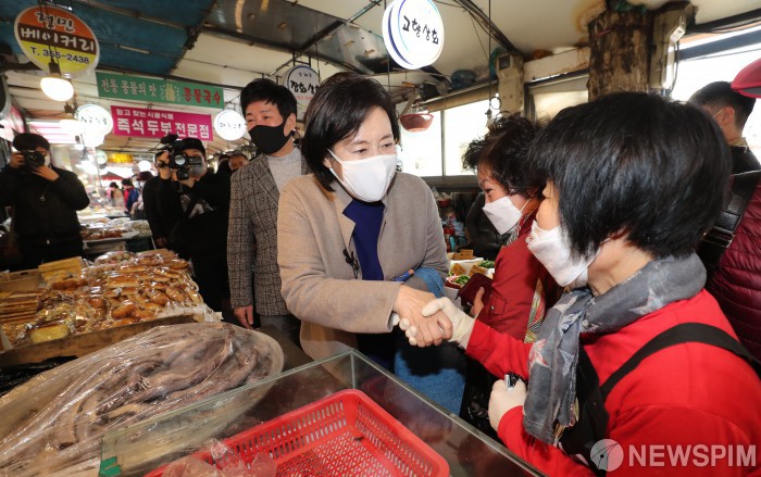 [서울=뉴스핌] 김학선 기자 = 박영선 더불어민주당 서울시장 후보가 14일 오후 'Again 서울을 걷다' 행사의 일환으로 서울 은평구 대조전통시장을 방문해 시민들과 인사를 나누고 있다. 2021.03.14 yooksa@newspim.com