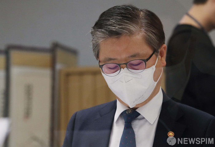 [서울=뉴스핌] 백인혁 기자 = 변창흠 국토교통부 장관이 17일 오전 서울 종로구 정부서울청사에서 열린 제17차 부동산시장 점검 관계장관회의에 참석해 홍남기 부총리 겸 기획재정부 장관의 모두발언을 경청하고 있다. 2021.03.17 dlsgur9757@newspim.com
