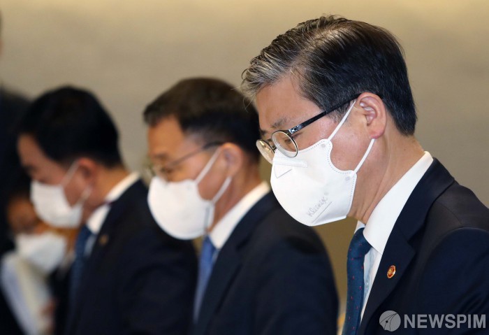 [서울=뉴스핌] 백인혁 기자 = 변창흠 국토교통부 장관이 17일 오전 서울 종로구 정부서울청사에서 열린 제17차 부동산시장 점검 관계장관회의에 참석해 홍남기 부총리 겸 기획재정부 장관의 모두발언을 경청하고 있다. 2021.03.17 dlsgur9757@newspim.com