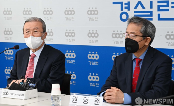 [서울=뉴스핌] 국회사진취재단 = 김종인 국민의힘 비상대책위원장(왼쪽)이 17일 서울 종로구 경실련 대강당에서 열린 정책간담회에서 발언을 하고 있다. 오른쪽은 권영준 경제정의실천시민연합 공동대표. 2021.03.17 photo@newspim.com
