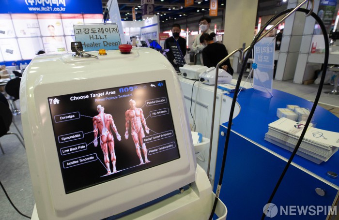 [서울=뉴스핌] 윤창빈 기자 = 18일 오전 서울 강남구 코엑스에서 열린 국제의료기기·병원설비전시회(KIMES 2021)에서 참가자들이 전시품을 관람하고 있다. KIMES 2021은 코엑스 전시장 A, B, C, D홀 전관과 그랜드볼룸 등 총 40000㎡의 규모로 개최되며 국내외 1200여개사가 첨단의료기기, 병원설비, 의료정보시스템, 헬스케어·재활기기, 의료관련용품 등 3만여 점을 전시 소개한다. 2021.03.18 pangbin@newspim.com