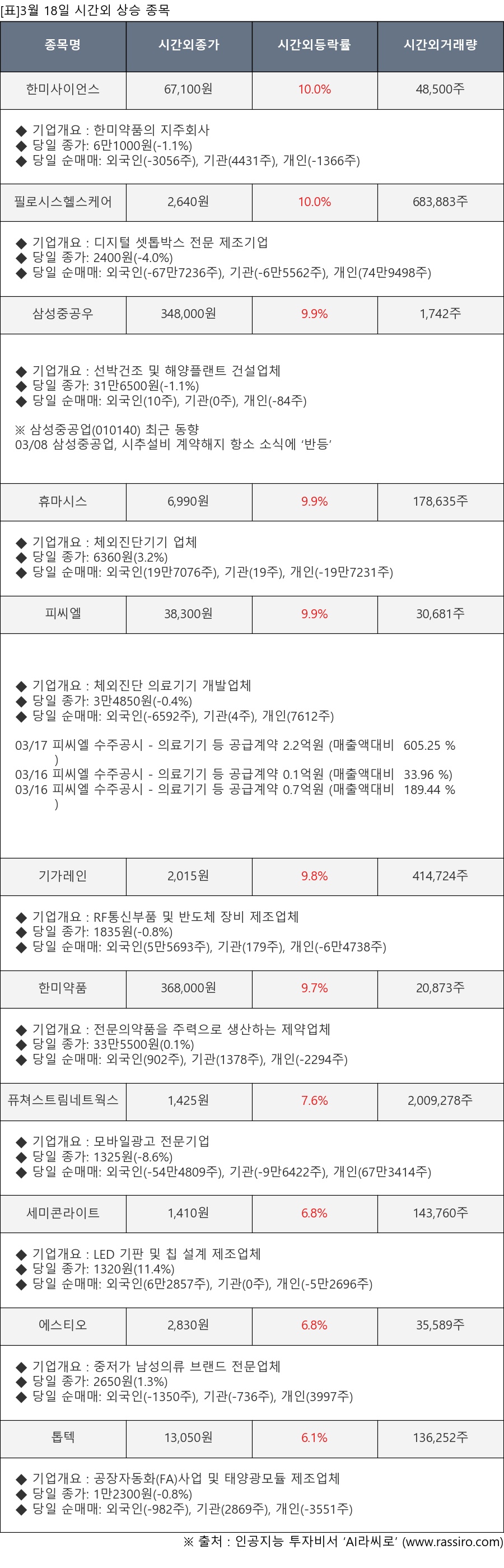 ※ 관련 종목: 한미사이언스, 필로시스헬스케어, 삼성중공우, 휴마시스, 피씨엘, 기가레인, 한미약품, 퓨쳐스트림네트웍스, 세미콘라이트, 에스티오, 톱텍