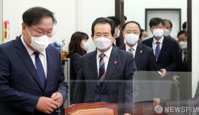 [서울=뉴스핌] 최상수 기자 = 정세균 국무총리가 19일 오전 국회 더불어민주당 당대표회의실에서 열린 제3차 고위당정협의회에 참석하고 있다. 왼쪽부터 김태년 당대표 직무대행, 정 총리, 홍남기 부총리, 김상조 청와대 정책실장. 2021.03.19 kilroy023@newspim.com