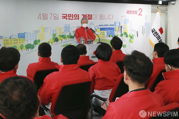 [서울=뉴스핌] 이형석 기자 = 김종인 국민의힘 비상대책위원장이 19일 오후 서울 여의도 중앙당사에서 열린 서울시장 후보 및 서울당협위원장 회의에서 인사말을 하고 있다. 2021.03.19 leehs@newspim.com