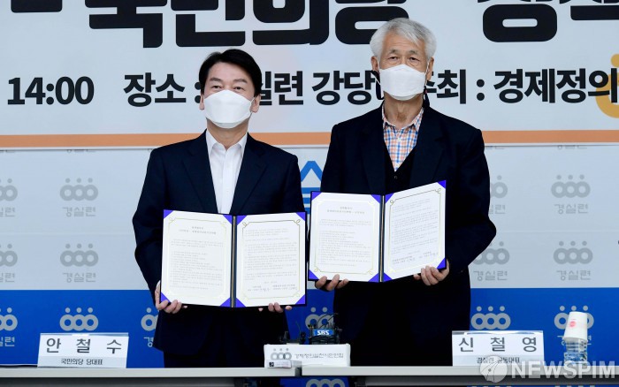 [서울=뉴스핌] 국회사진취재단 = 안철수 국민의당 서울시장 후보와 신철영 경실련 공동대표가 22일 서울 종로구 경제정의실천시민연합에서 열린 ‘국민의당-경실련 정책협약식’에서 협약서에 서명한 뒤 기념촬영을 하고 있다. 2021.03.22 photo@newspim.com
