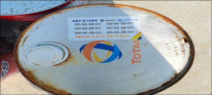속초해경은 최근 3년간 실명제를 통해 폐윤활유 197톤을 수거했으며 고유번호 스티커 4200장을 제작해 수협에 배부했다.