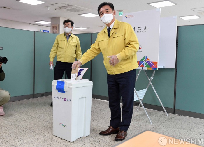 [서울=뉴스핌] 백인혁 기자 = 서정협 서울시장 권한대행이 23일 오후 서울 중구 서울유스호스텔 생활치료센터에 마련된 특별사전투표소에서 코로나19 대비 사전 투표 모의실습을 진행하고 있다. 2021.03.23 dlsgur9757@newspim.com