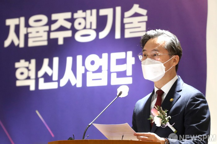 [서울=뉴스핌] 정일구 기자 = 박진규 산업통상자원부 차관이 24일 오후 서울 서초구 자동차회관에서 열린 자율주행기술개발혁신사업단 출범식에서 축사를 하고 있다. 2021.03.24 mironj19@newspim.com