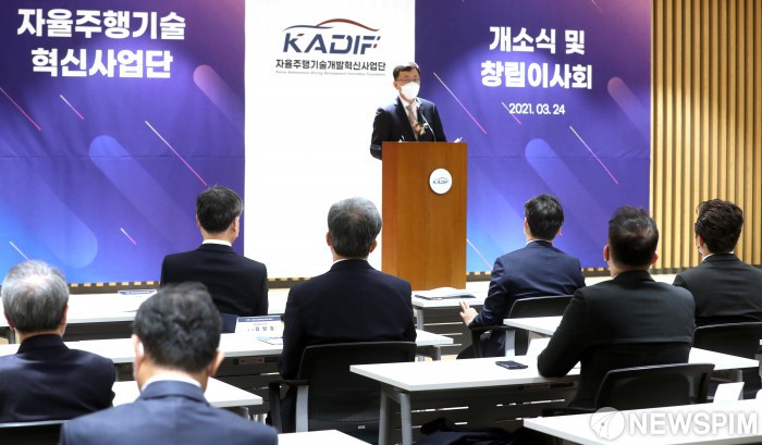 [서울=뉴스핌] 정일구 기자 = 김정원 과학기술정보통신부 정보통신정책실장이 24일 오후 서울 서초구 자동차회관에서 열린 자율주행기술개발혁신사업단 출범식에서 축사를 하고 있다. 2021.03.24 mironj19@newspim.com