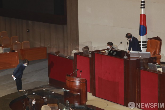 [서울=뉴스핌] 이형석 기자 = 김진애 열린민주당 의원이 24일 오후 서울 여의도 국회에서 열린 본회의에서 의원직 사퇴에 관한 신상발언을 마치고 박병석 국회의장과 인사하고 있다. 2021.03.24 leehs@newspim.com