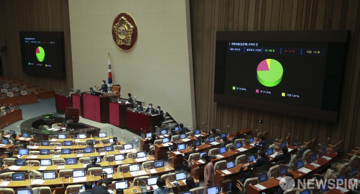 [서울=뉴스핌] 이형석 기자 = 박병석 국회의장이 24일 오후 서울 여의도 국회에서 열린 본회의에서 김진애 국회의원 사직의 건을 가결하고 있다. 2021.03.24 leehs@newspim.com
