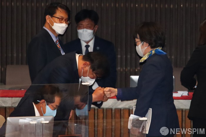 [서울=뉴스핌] 최상수 기자 = 24일 오후 국회에서 열린 본회의에서 더불어민주당 김태년 당대표 직무대행(왼쪽)과 열린민주당 김진애 의원이 인사하고 있다. 2021.03.24 kilroy023@newspim.com