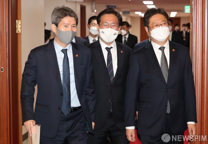 [서울=뉴스핌] 김학선 기자 = 이인영 통일부 장관과 성윤모 산업통상자원부 장관, 황희 문화체육관광부 장관이 25일 서울 종로구 정부서울청사에서 열린 임시국무회의에 참석하고 있다. 2021.03.25 yooksa@newspim.com