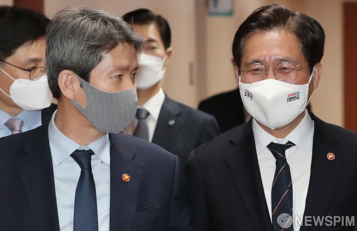 [서울=뉴스핌] 김학선 기자 = 이인영 통일부 장관과 성윤모 산업통상자원부 장관이 25일 서울 종로구 정부서울청사에서 열린 임시국무회의에 참석하며 대화하고 있다. 2021.03.25 yooksa@newspim.com