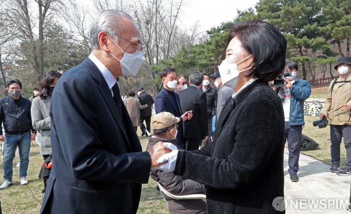 [서울=뉴스핌] 국회사진취재단 = 안중근 의사 순국 111주년 추모식이 26일 오전 서울 용산구 효창공원 안중근 의사 묘역에서 열려 더불어민주당 서울시장 후보인 박영선 후보가 행사가 열리기전 장준하선생의 아들 장호건씨를 만나 인사를 나누고 있다. 2021.03.26 photo@newspim.com
