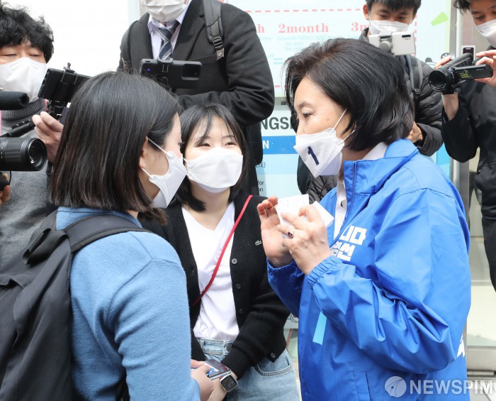 [서울=뉴스핌] 국회사진취재단 = 박영선 더불어민주당 서울시장 후보가 26일 오후 서울 서대문구 신촌이대거리를 찾아 거리유세 중 대학생들의 고민상담을 하고 있다. 2021.03.26 photo@newspim.com