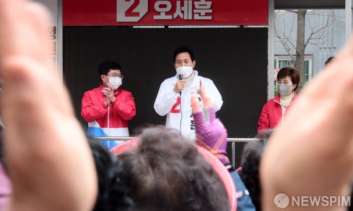 [서울=뉴스핌] 국회사진취재단 = 국민의힘 오세훈 서울시장 후보가 26일 오후 서울 구로구 구일역육교 앞에서 열린 선거유세에서 서울시민들에게 지지를 호소하고 있다. 2021.03.26 photo@newspim.com