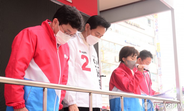 [서울=뉴스핌] 국회사진취재단 = 국민의힘 오세훈 서울시장 후보가 26일 오후 서울 구로구 구일역육교 앞에서 열린 선거유세에서 서해수호의 날 추모 묵념을 하고 있다. 2021.03.26 photo@newspim.com