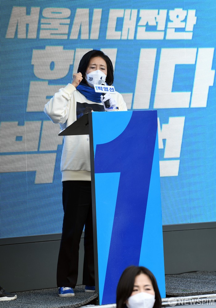 [서울=뉴스핌] 국회사진취재단 = 박영선 더불어민주당 서울시장 후보가 28일 오전 서울 서초 고속터미널 광장에서 집중유세를 펼치고 있다. 2021.03.28 photo@newspim.com