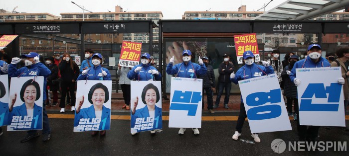 [서울=뉴스핌] 국회사진취재단 = 박영선 더불어민주당 서울시장 후보의 서초구 집중유세가 28일 오전 서울 서초구 고속터미널 광장에서 열린 가운데 선거운동원들이 지지를 호소하고 있다. 2021.03.28 photo@newspim.com