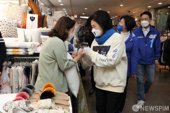 [서울=뉴스핌] 국회사진취재단 = 박영선 더불어민주당 서울시장 후보가 28일 서울 서초구 고속터미널 지하상가를 찾아 상인 및 시민들에게 지지를 호소하고 있다. 2021.03.28 photo@newspim.com