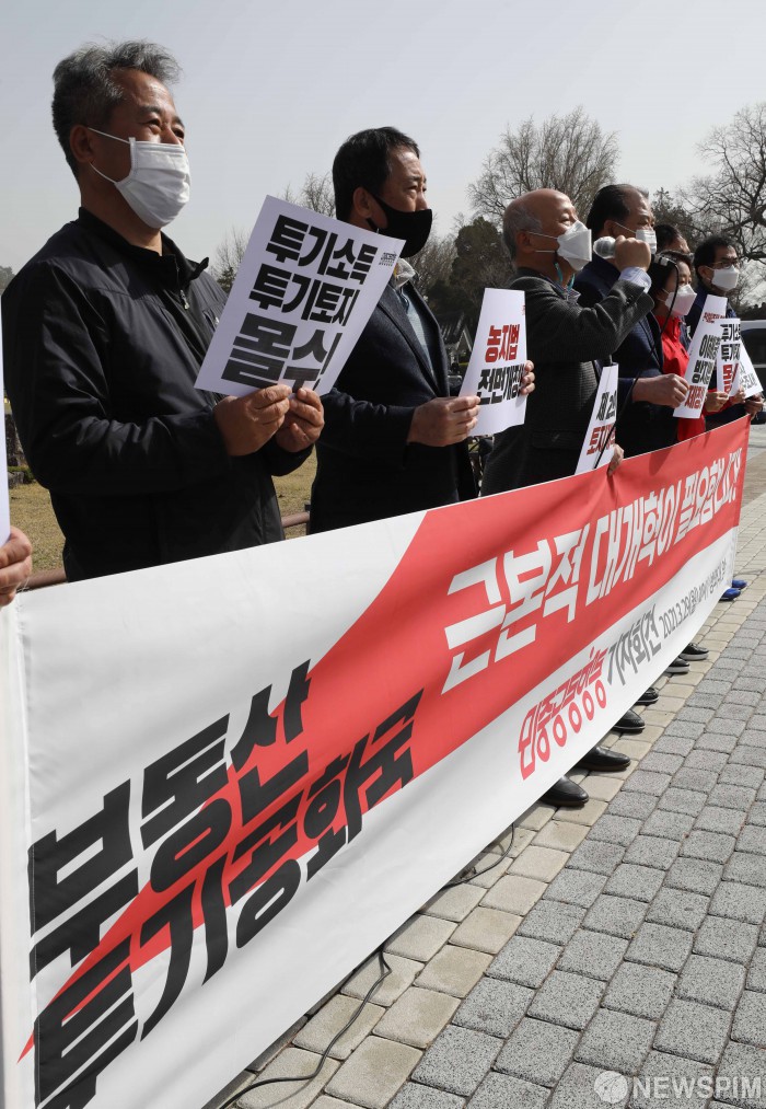 [서울=뉴스핌] 백인혁 기자 = 민중공동행동 관계자들이 29일 오전 서울 종로구 청와대 앞 분수대 광장에서 LH사태에 대한 철저한 진상규명과 근본적 부동산 개혁을 촉구하는 기자회견을 하고 있다. 2021.03.29 dlsgur9757@newspim.com