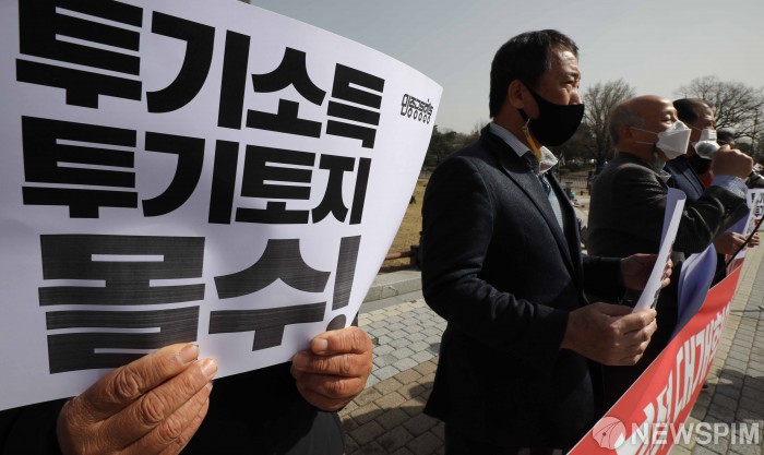 [서울=뉴스핌] 백인혁 기자 = 민중공동행동 관계자들이 29일 오전 서울 종로구 청와대 앞 분수대 광장에서 LH사태에 대한 철저한 진상규명과 근본적 부동산 개혁을 촉구하는 기자회견을 하고 있다. 2021.03.29 dlsgur9757@newspim.com