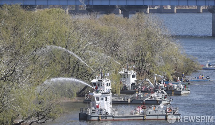 물 뿌리며 밤섬 청소하는 한강사업본부 관계자