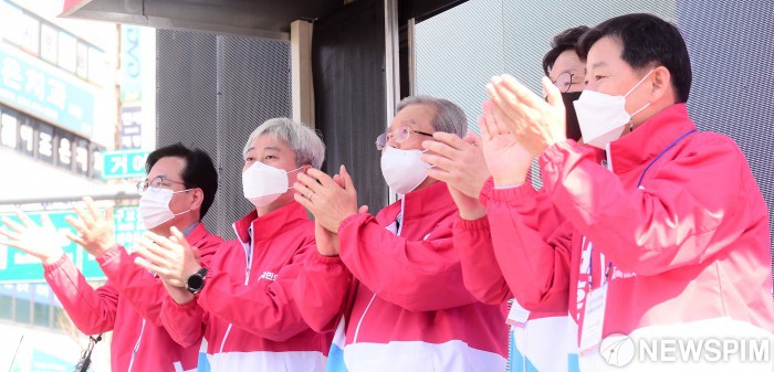 [서울=뉴스핌] 국회사진취재단 = 김종인 국민의힘 비상대책위원장이 30일 오후 서울 송파구 거여역사거리에서 4.7 서울시장 재보궐선거 오세훈 서울시장 후보 지원유세를 마치고 박수를 치고 있다. 2021.03.30 photo@newspim.com