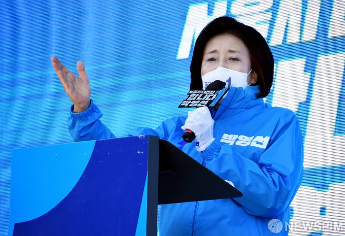 [서울=뉴스핌] 국회사진취재단 = 박영선 더불어민주당 서울시장 후보가 30일 서울 성동구 왕십리역 광장에서 열린 집중유세에서 지지를 호소하고 있다. 2021.03.30 photo@newspim.com