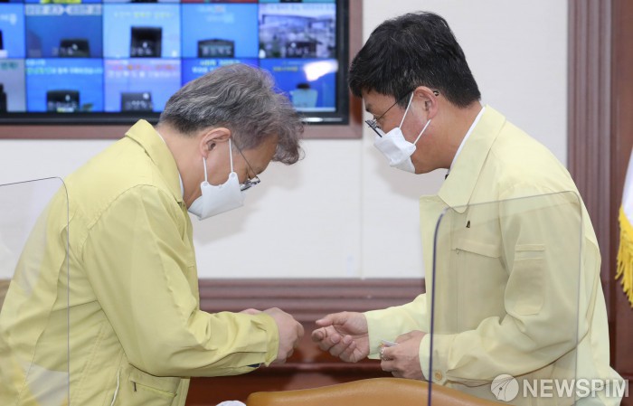 [서울=뉴스핌] 김학선 기자 = 권칠승 중소벤처기업부 장관(왼쪽)과 안도걸 신임 기획재정부 2차관이 31일 서울 종로구 정부서울청사에서 열린 신종 코로나바이러스 감염증(코로나19) 대응 중앙재난안전대책본부 회의에서 인사를 나누고 있다. 2021.03.31 yooksa@newspim.com