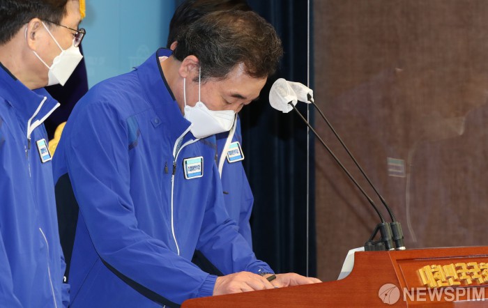 [서울=뉴스핌] 최상수 기자 = 더불어민주당 이낙연 상임선대위원장이 31일 국회 소통관에서 대국민호소 기자회견을 마친 뒤 인사하고 있다. 2021.03.31 kilroy023@newspim.com