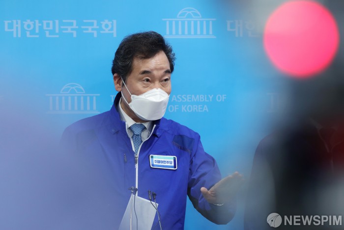 [서울=뉴스핌] 최상수 기자 = 더불어민주당 이낙연 상임선대위원장이 31일 국회 소통관에서 대국민호소 기자회견을 마친 뒤 취재진의 질문에 답변하고 있다. 2021.03.31 kilroy023@newspim.com