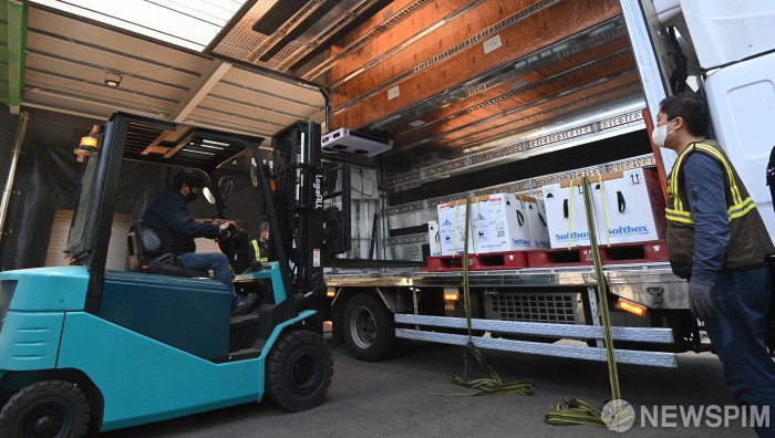 [평택=뉴스핌] 사진공동취재단 = 31일 오전 경기도 평택시 오성면 ㈜한국초저온 물류센터에서 관계자들이 화이자와 직접 계약을 통해 확보한 백신 추가 물량 50만 회분을 지게차를 이용해 백신을 창고로 옮기고 있다. 이날 물류센터로 옮겨져 초저온 보관된 백신은 49개소 접종센터로 옮겨져 다음달 1일 시작되는 75세 이상 어르신과 노인시설 입소·종사자 접종에 사용될 예정이다. 2021.03.31 photo@newspim.com