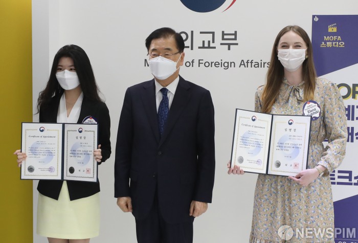 [서울=뉴스핌] 김학선 기자 = 정의용 외교부 장관이 31일 오후 서울 종로구 외교부청사에서 열린 'MOFA 스튜디오 개소식 및 KOREAZ 명예기자단 발대식'에서 명예기자들과 함께 기념촬영을 하고 있다. 2021.03.31 yooksa@newspim.com