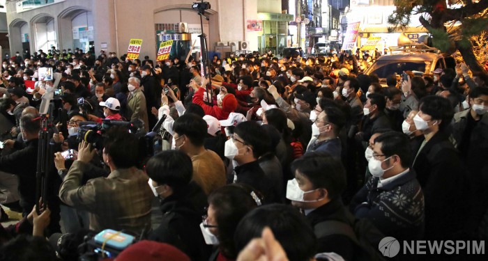 [서울=뉴스핌] 국회사진취재단 = 31일 오후 서울 동작구 사당동 태평백화점앞에서 오세훈 국민의힘 서울시장 후보의 발언을 시민들이 경청하고 있다. 2021.03.31 photo@newspim.com