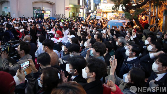 [서울=뉴스핌] 국회사진취재단 = 31일 오후 서울 동작구 사당동 태평백화점앞에서 오세훈 국민의힘 서울시장 후보의 발언을 시민들이 경청하고 있다. 2021.03.31 photo@newspim.com