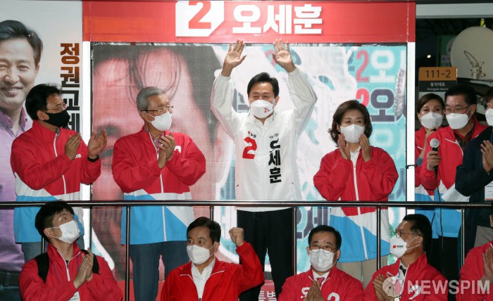 [서울=뉴스핌] 국회사진취재단 = 오세훈 국민의힘 서울시장 후보가 31일 오후 서울 동작구 사당동 태평백화점앞에서 유세를 하고 있다. 2021.03.31 photo@newspim.com