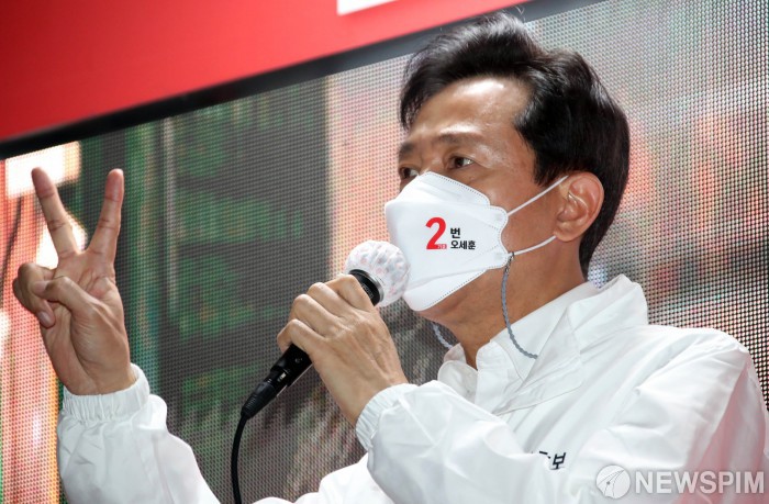 [서울=뉴스핌] 국회사진취재단 = 오세훈 국민의힘 서울시장 후보가 31일 오후 서울 동작구 사당동 태평백화점앞에서 유세를 하고 있다. 2021.03.31 photo@newspim.com