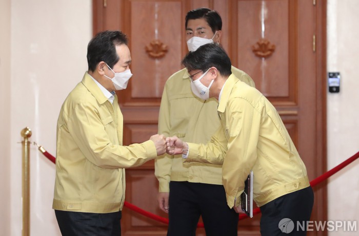 [서울=뉴스핌] 김학선 기자 = 정세균 국무총리가 1일 서울 종로구 정부서울청사에서 열린 신종 코로나바이러스 감염증(코로나19) 대응 중앙재난안전대책본부 회의에 참석하며 이억원 신임 기획재정부 1차관과 인사를 나누고 있다. 2021.04.01 yooksa@newspim.com
