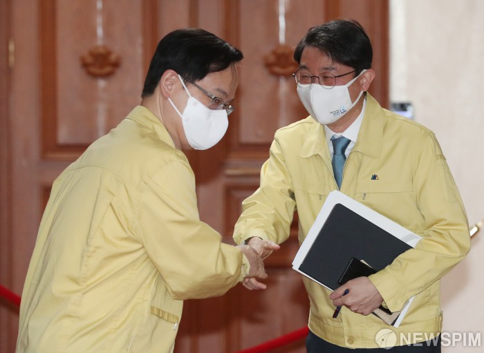 [서울=뉴스핌] 김학선 기자 = 이억원 신임 기획재정부 1차관(오른쪽)이 1일 서울 종로구 정부서울청사에서 열린 신종 코로나바이러스 감염증(코로나19) 대응 중앙재난안전대책본부 회의를 앞두고 강성천 중소벤처기업부 차관과 인사를 나누고 있다. 2021.04.01 yooksa@newspim.com