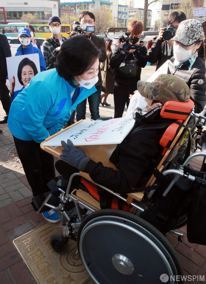 [서울=뉴스핌] 국회사진취재단 = 박영선 더불어민주당 서울시장 후보가 1일 오전 서울 마포구 합정역에서 발달장애인과 대화하며 의견을 듣고 있다. 2021.04.01 photo@newspim.com