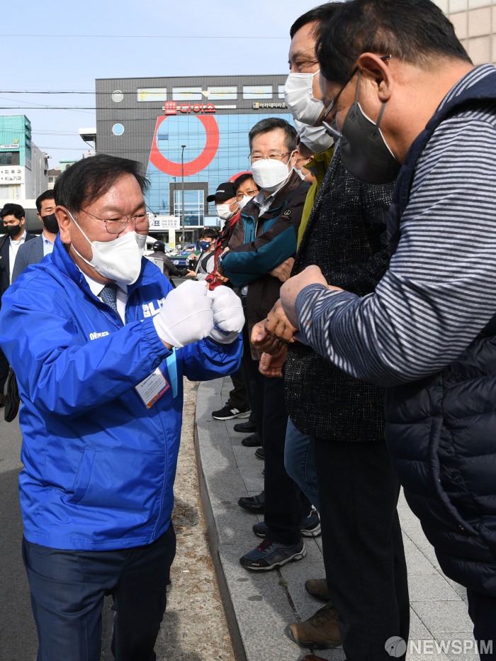 [서울=뉴스핌] 국회사진취재단 = 김태년 더불어민주당 당대표 직무대행이 4.7 재보궐선거 사전투표를 하루 앞둔 1일 서울 광진구 아차산역에서 열린 유세에서 유권자들과 인사하며 한표를 호소하고 있다. 2021.04.01 photo@newspim.com