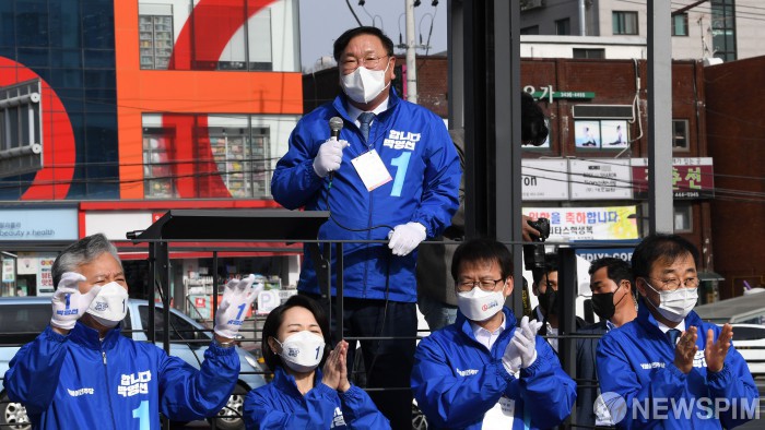 [서울=뉴스핌] 국회사진취재단 = 김태년 더불어민주당 당대표 직무대행이 4.7 재보궐선거 사전투표를 하루 앞둔 1일 서울 광진구 아차산역에서 열린 유세에서 한표를 호소하고 있다. 2021.04.01 photo@newspim.com