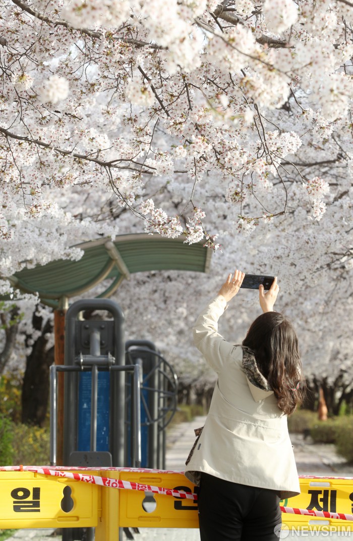 [서울=뉴스핌] 정일구 기자 = 서울 낮 기온이 20도 이상 오르며 완연한 봄 날씨를 보인 1일 오후 서울 영등포구 안양천 제방산책로가 신종 코로나바이러스 감염증(코로나19) 확산 방지를 위해 출입이 통제된 가운데 만개한 벚꽃을 보러 나온 시민들이 봄기운을 만끽하고 있다. 2021.04.01 mironj19@newspim.com